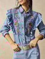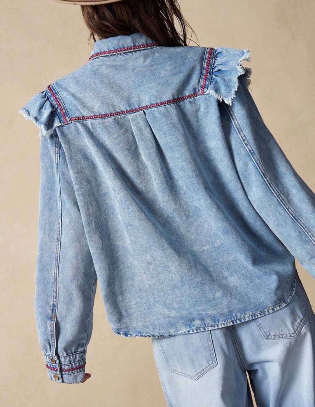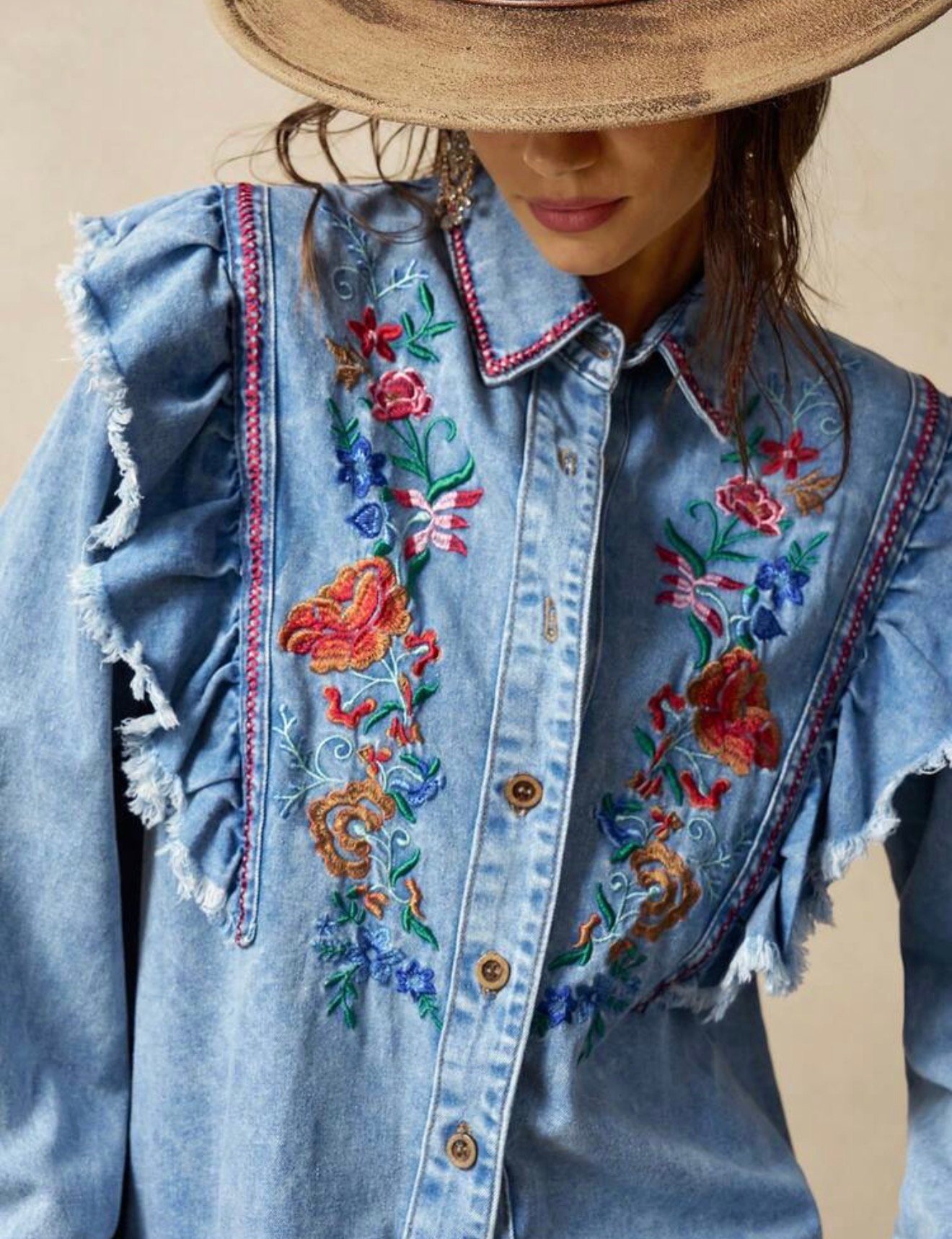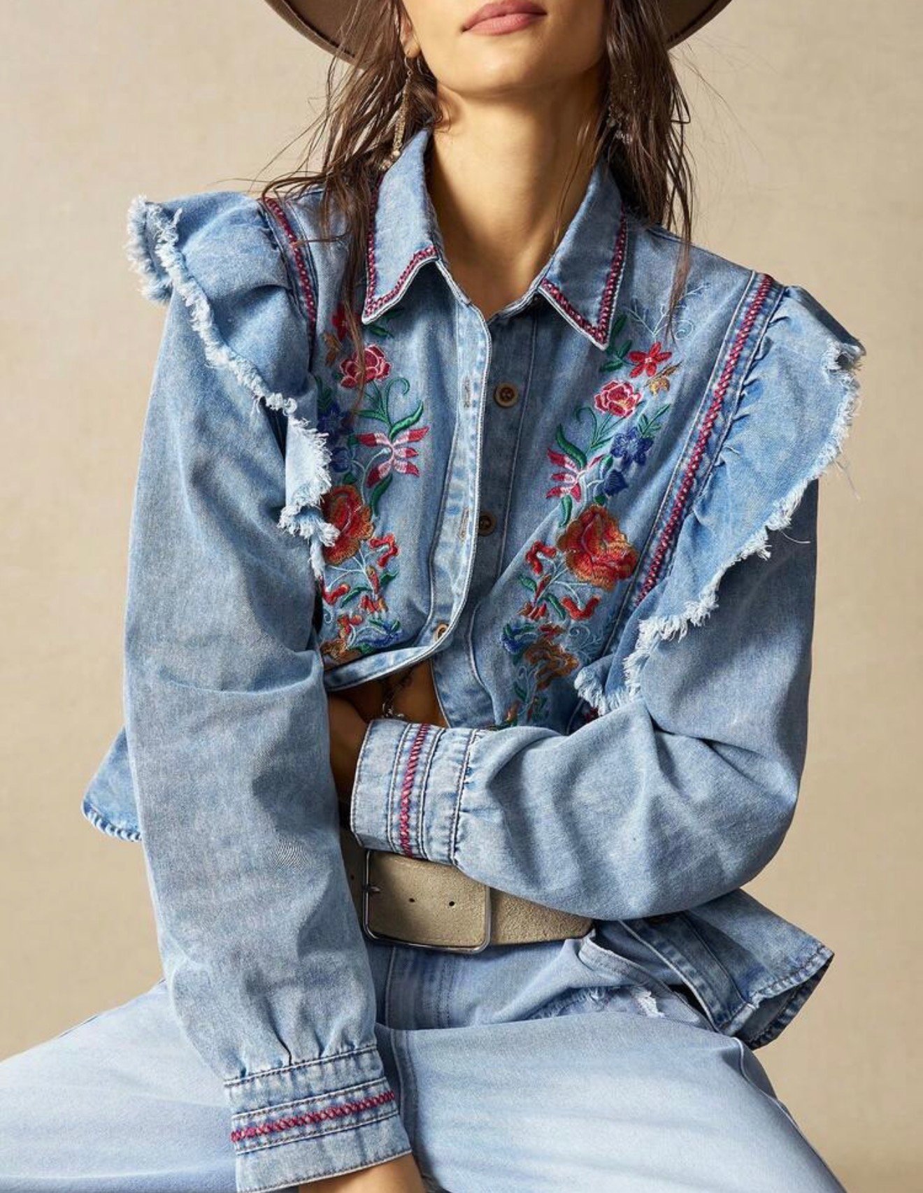 The Desert Bloom Denim Shirt brings effortless character to your wardrobe with its soft washed denim and intricate floral embroidery. Inspired by desert tones and vintage western aesthetics, this piece stands out with raw-edge ruffle details along the shoulders, adding movement and a subtle statement silhouette.
