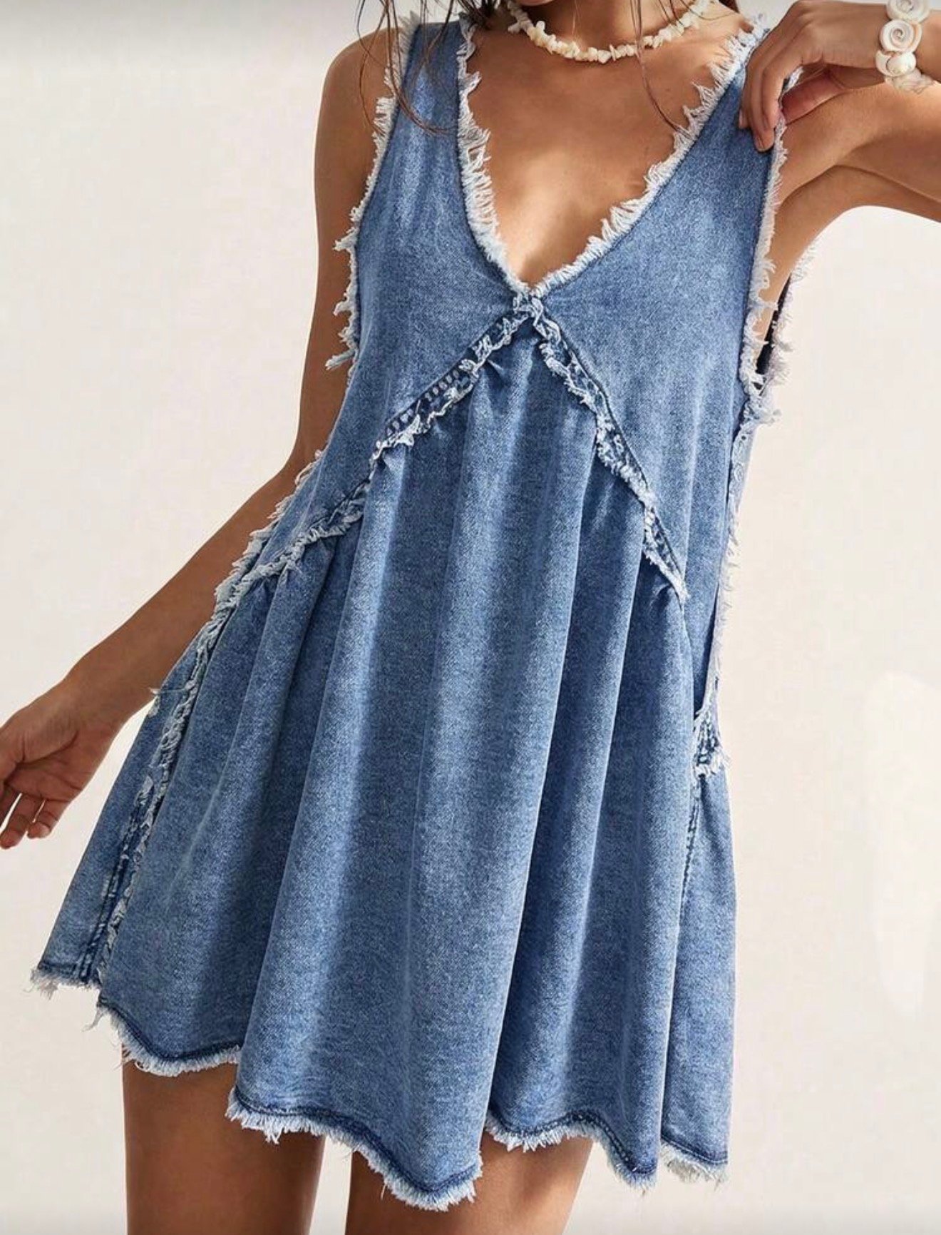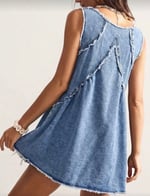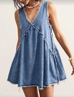 The Drift Denim Dress blends relaxed coastal style with a playful vintage silhouette. Made from soft lightweight denim, this sleeveless mini dress features a deep V neckline, raw frayed edges, and layered panels that create a loose, flowing shape.