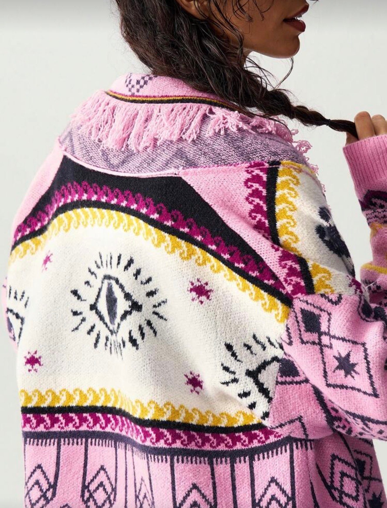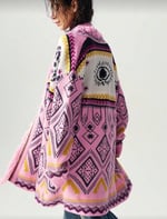 The Eye Cardigan is a bold knitwear statement inspired by bohemian textures and symbolic design. Featuring an eye motif across the back and layered geometric patterns throughout the body, this piece blends artistry with relaxed modern styling.