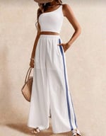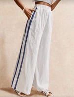The embroidered eye detail on the back pocket adds a unique graphic touch, while the contrast side stripe creates a subtle modern look. The elastic waistband provides comfort and flexibility, making these pants easy to style with tanks, knitwear, or relaxed tops.